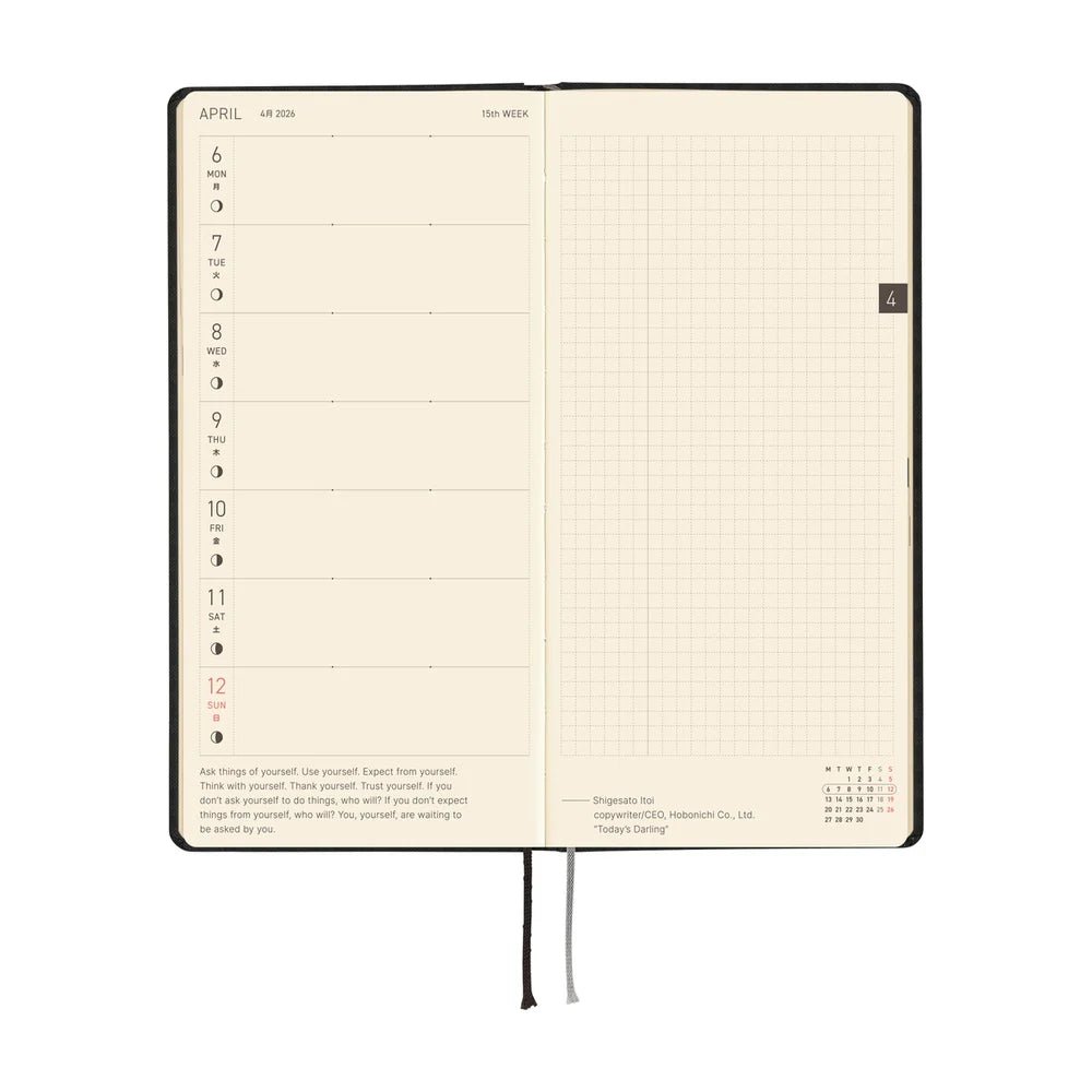 Hobonichi Weeks es una agenda compacta conocida por su diseño delgado y su versatilidad. Presenta un formato semanal horizontal en la página izquierda y una página de notas en blanco en la derecha, ofreciendo amplio espacio para programación, listas de tareas y anotaciones de eventos. Incluye calendarios mensuales, páginas de notas adicionales y características especiales que ayudan a mantener la organización. Su tamaño portátil y practicidad la convierten en una de las opciones preferidas para quienes buscan una agenda elegante para usar sobre la marcha.
