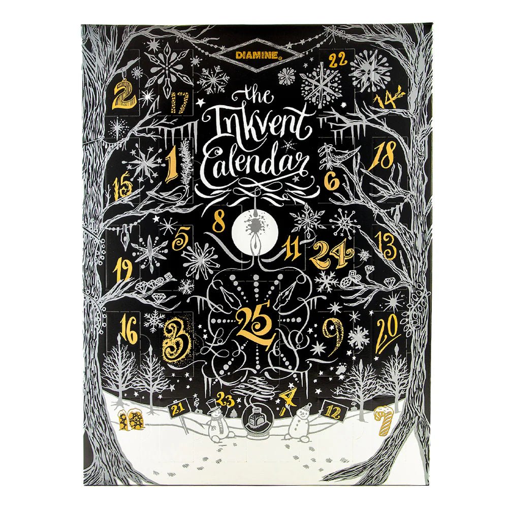 Diamine presenta el Calendario de Adviento Inkvent 2024 - Edición Negra. En este calendario exclusivo, encontrarás 25 nuevos colores de tinta Diamine. Al igual que los calendarios de adviento tradicionales, tiene 25 puertas, cada una abriéndose día a día para revelar una botella de tinta sorpresa.