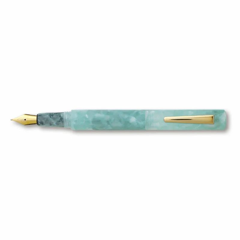 Una pluma fuente de acrílico veteado con una fina punta chapada en oro de la colección Attaché. Hermosa textura marmoleada que rodea su cuerpo translúcido, con varias facetas de tonos oscuros y claros que se iluminan al sostenerla en un ángulo.