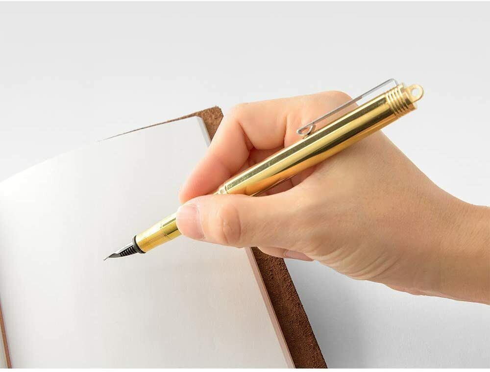 Es una pluma fuente de latón que es compacta al transportarla y muy cómoda al escribir. La textura del latón evoluciona con el tiempo conforme la usas, y en la parte superior cuenta con un aro al que puedes sujetar ganchos o cuerdas. También puedes usarla sin clip retirando la pieza del aro.